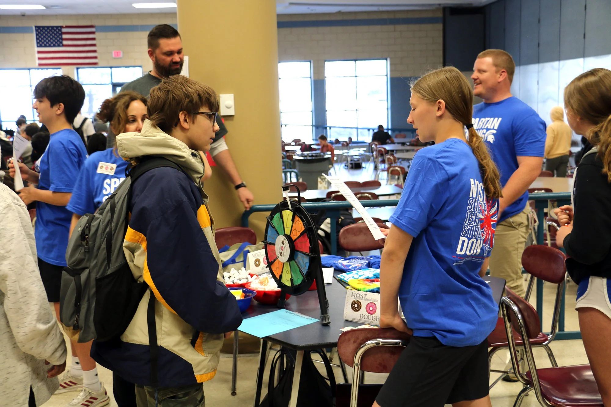 At lunch, Minnesota Tobacco-free Alliance Executive Director and IGH SPARC Member Elyse Levine Less set up a trivia challenge for Simley students. Students answered trivia questions about the dangers of vaping and spun a prize wheel to win branded pens, shirts, and more. Students from Spartan SPARC also helped ask trivia questions.